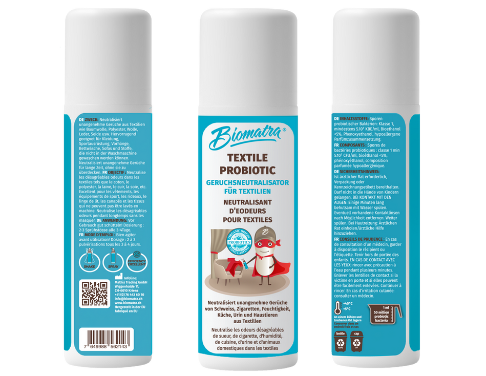 Perfect for clothing, sports equipment, curtains, and other fabrics, TEXTILE PROBIOTIC does not damage textiles, leaves no stains, and avoids a wet effect. Its eco-friendly, biodegradable formula provides freshness that can last several days — making it an excellent choice for active lifestyles while reflecting Biomatra’s commitment to sustainable living.